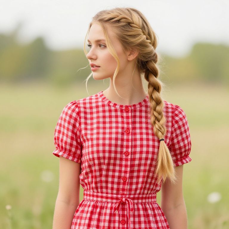 Girl with blonde hair and braids in a red and white checkered dress.