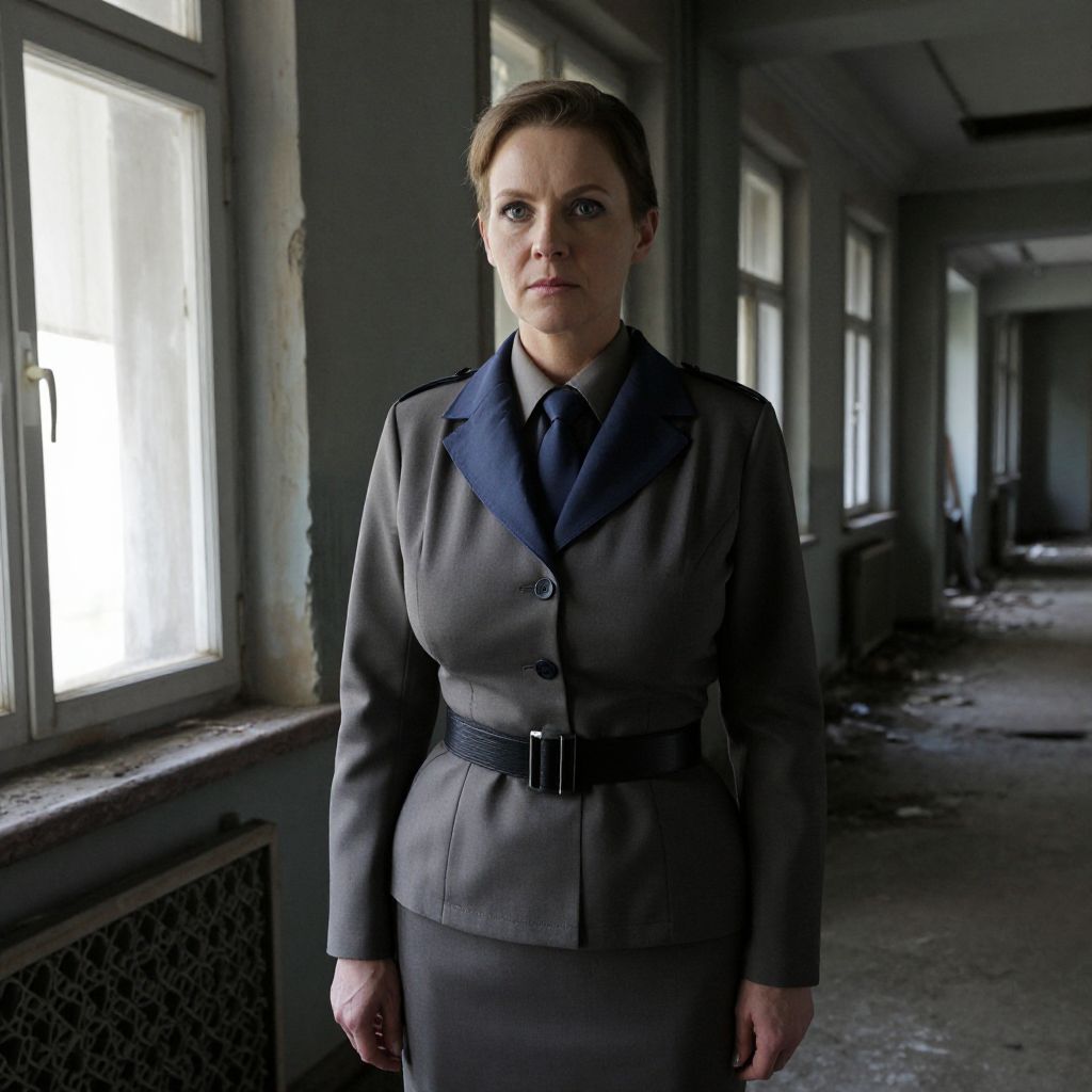 Photograph of a stern-looking woman in a gray military-style uniform with a navy blue collar and belt, standing in a dimly lit, abandoned hallway. Her light brown hair is neatly pulled back. She has fair skin and blue eyes. The hallway has large, dirty windows on the left, and peeling paint on the walls, with debris scattered on the floor. The light from the windows casts a soft glow on her face, highlighting her determined expression. The overall atmosphere is bleak and somber.