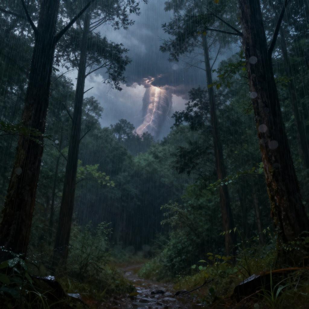 A photorealistic scene of a dense forest during a heavy nighttime rainstorm. Tall trees frame a winding forest path as rain cascades downward. Dramatic lighting highlights distant thunderclouds with visible lightning, creating a moody and immersive atmosphere. The image features high detail with bokeh effects and volumetric light filtering through the canopy, emphasizing rain droplets and wet foliage.