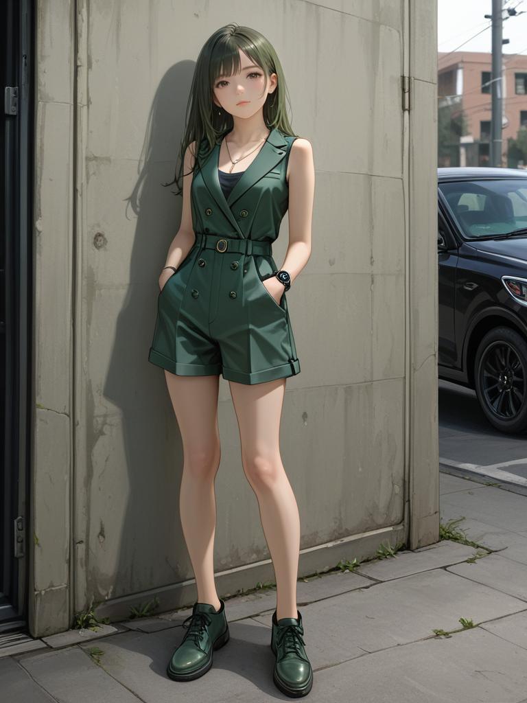 This digital anime-style illustration features a young woman with long black hair and fair skin standing against a gray, weathered concrete wall. She wears a dark green, sleeveless, belted romper with a deep V-neck, hands in pockets, and black ankle boots with laces. Her expression is neutral, with large, expressive eyes. The background includes a partially visible black car on the right and urban buildings in the distance. The image has a realistic lighting effect, with shadows enhancing the texture of the wall and pavement.