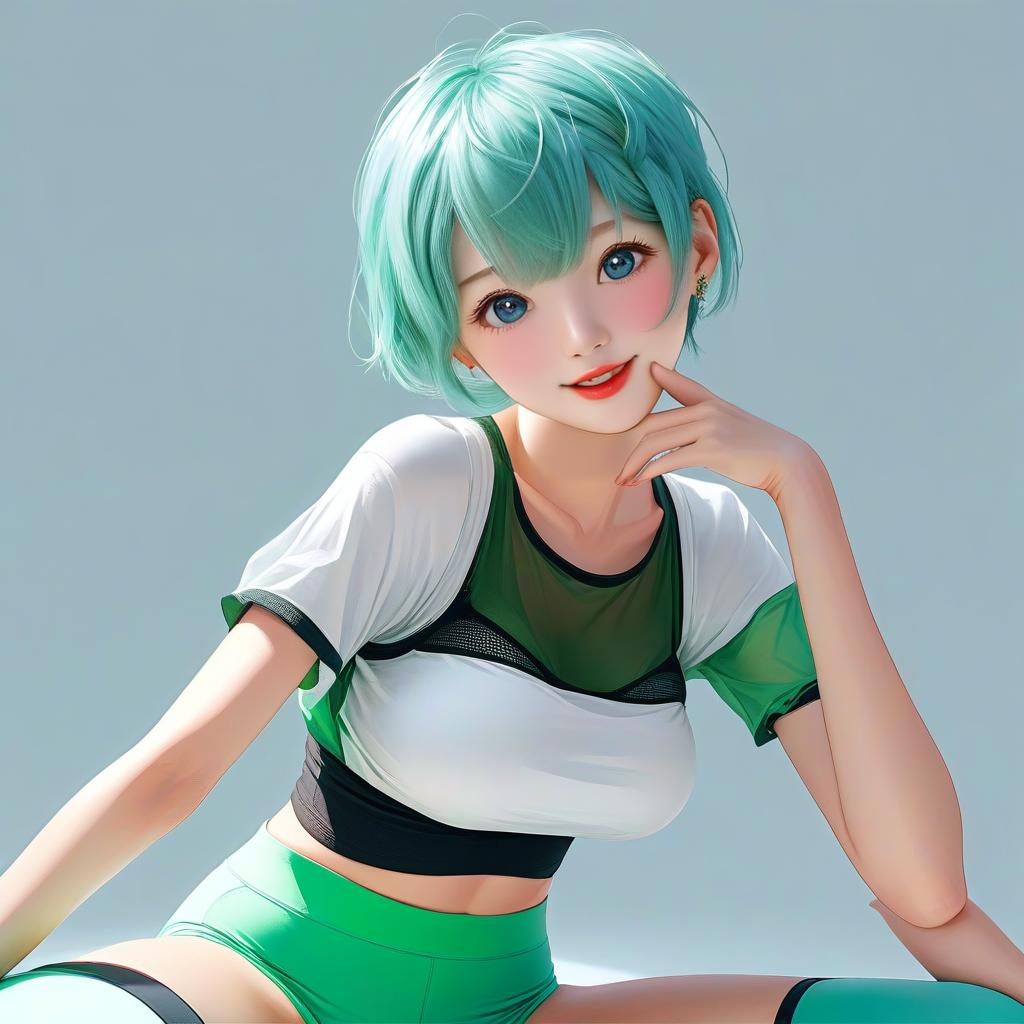 Digital anime-style drawing of a cute girl with teal hair, blue eyes, wearing a white and green sports top and shorts, sitting against a light blue
