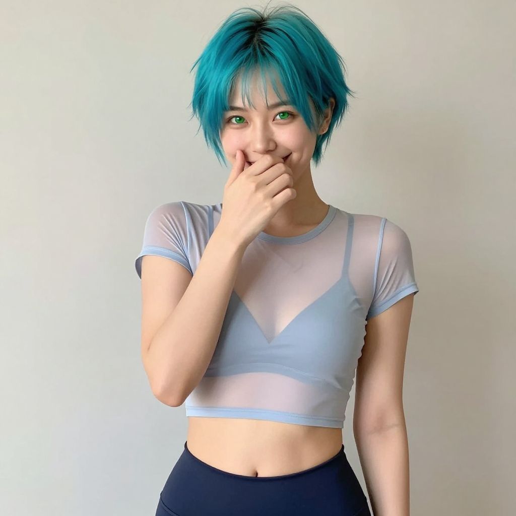 (constricted pupils, small pupils:1), 1girl, looking at viewer, small breasts, (pixie cut:1.3), (cyan dyed hair:1.1), bright green eyes, covering mouth, arm under breasts, hand over own mouth, laughing, ojou-sama pose, smile, smug, bra visible through clothes, crop top, leggings, see-through, shirt, short sleeves, yoga pants