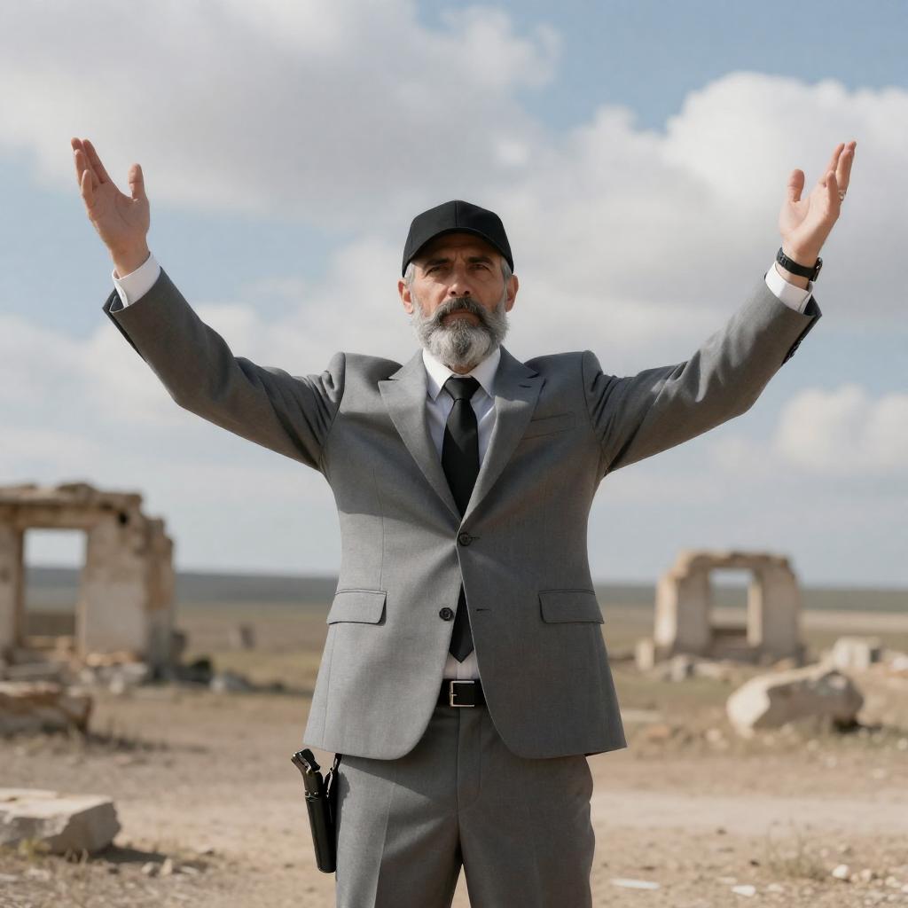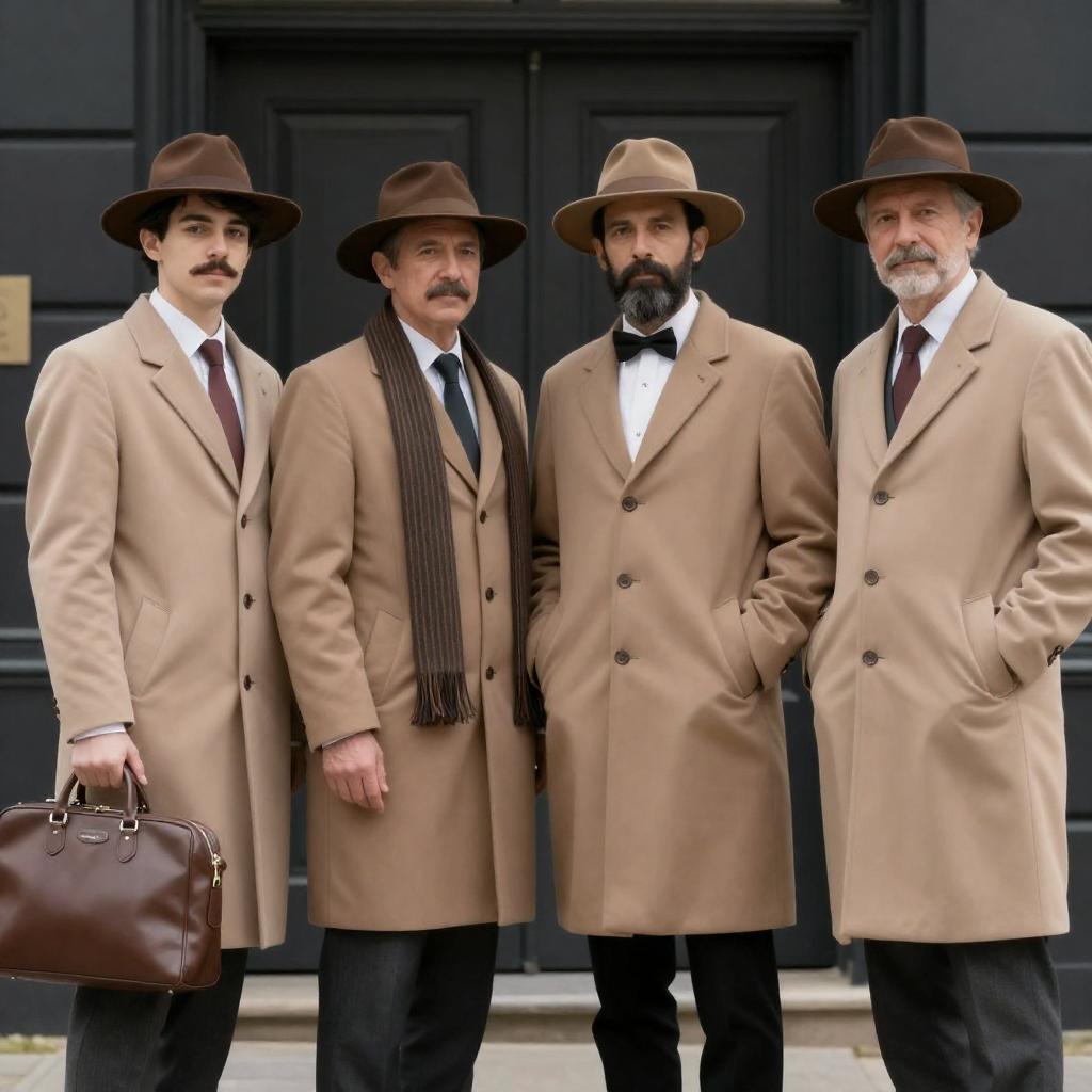 Photograph of six men in 1930s-style suits and hats standing in a crowd. Five wear dark blue or gray suits, one in beige. Central man with beard holds a camera, gesturing. Crowded background, sunlight. Men smile or look serious. Hats vary in style. Casual, outdoor setting.