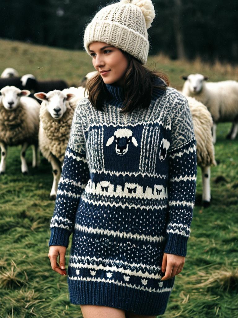 Sheep Dress, wearing a knitted sweater and a knitted hat