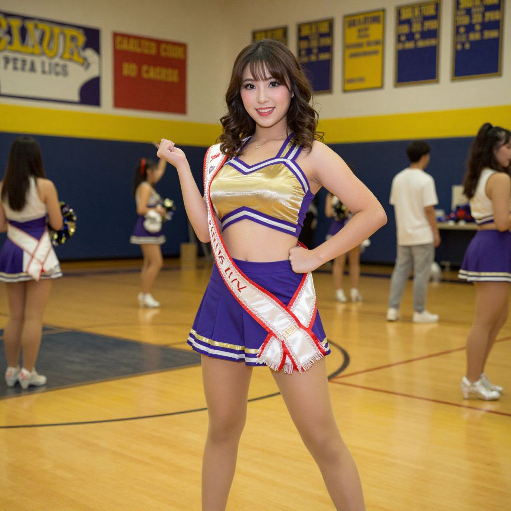 Photograph of an Asian cheerleader in a gold and blue uniform, holding a red and white sash, standing confidently in a gym with other cheer