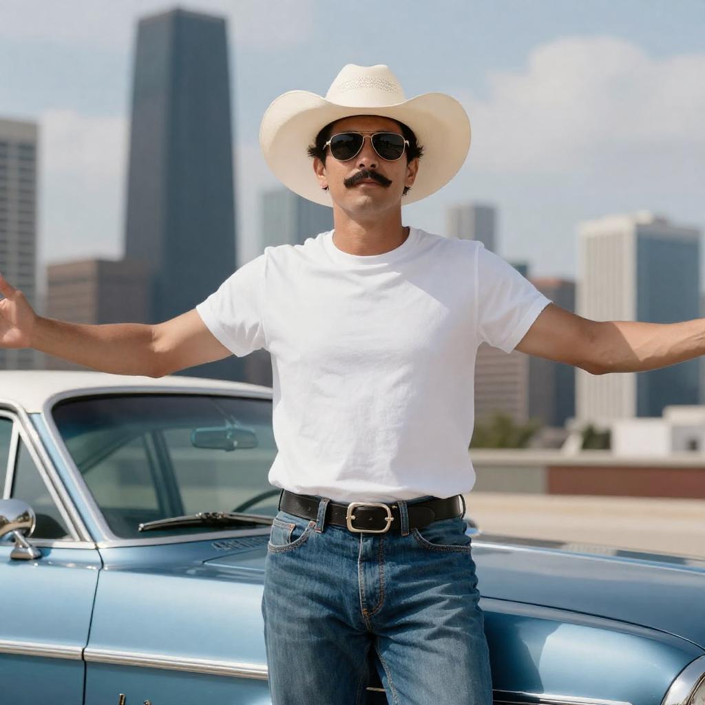 Photograph of a man in a white button-up shirt, tan cowboy hat, and sunglasses. He has a silver necklace and a hairy chest. Background includes blurred people, a woman with brown hair, and another woman with long dark hair. The setting is outdoors with greenery. The man is looking to the side with a neutral expression.