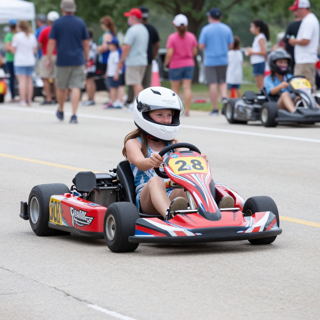 Photograph of a young girl in a white helmet and blue dress racing a red go-kart with number 23, surrounded by spectators on a street