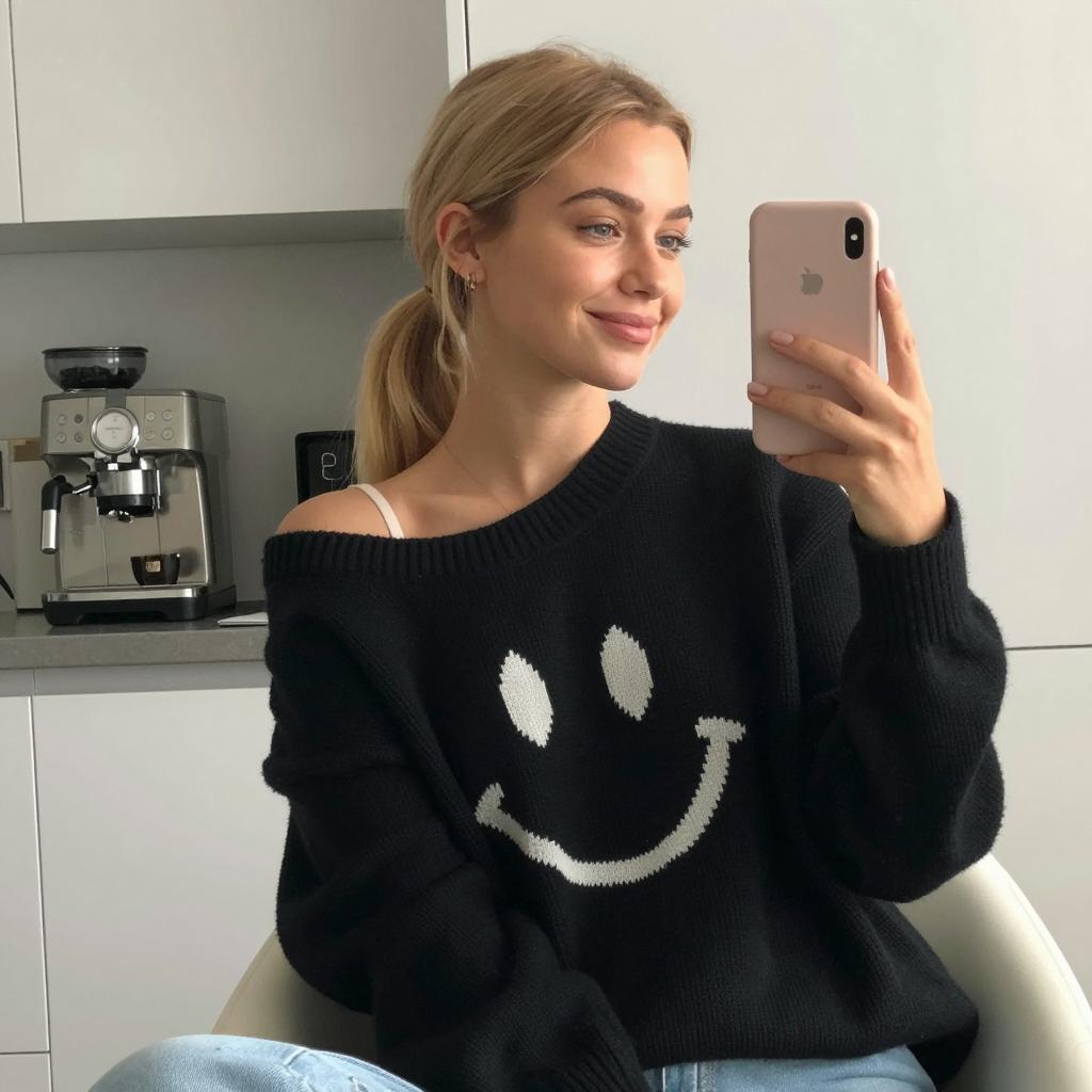 Blonde Woman Taking Mirror Selfie in Black Smiley Sweater