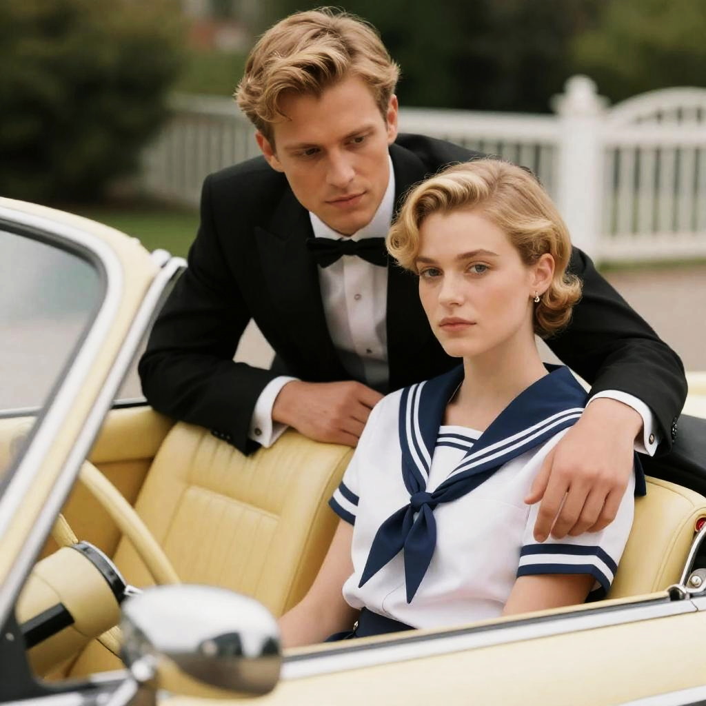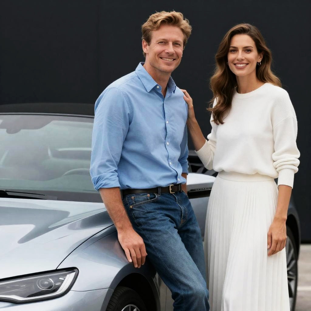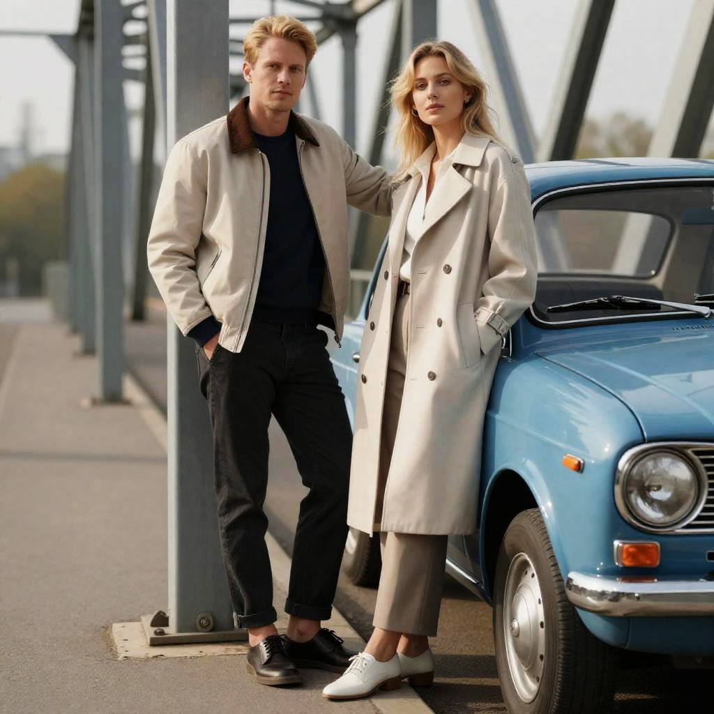 Photograph of a man and woman standing beside a blue vintage car on a metal bridge. Man with short blonde hair, light jacket, and dark pants, leaning against bridge. Woman with blonde hair, light coat, and white shoes, standing next to him. Blue car to the right, bridge structure in background. Both with neutral expressions. Bright sunlight.