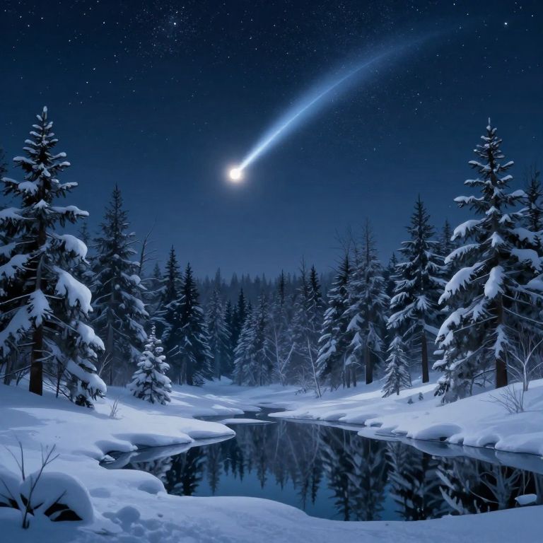 Photograph of a serene winter night landscape featuring a starry sky with a bright comet streaking across, illuminating the snow-covered forest. Tall pine trees, heavily laden with snow, frame a calm, reflective creek in the foreground. The deep blue and black hues of the sky contrast with the white snow, creating a tranquil, otherworldly scene. The comet's tail is vividly blue, adding a dramatic touch to the peaceful winter setting.