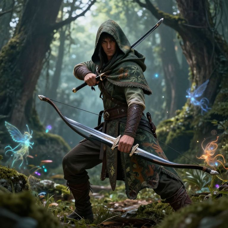 Male DnD ranger in battle stance in a mystical woodland clearing, armed with dual short swords and a bow, wearing a hooded cloak with nature-inspired patterns, surrounded by ethereal light and forest spirits, hyper-realistic style