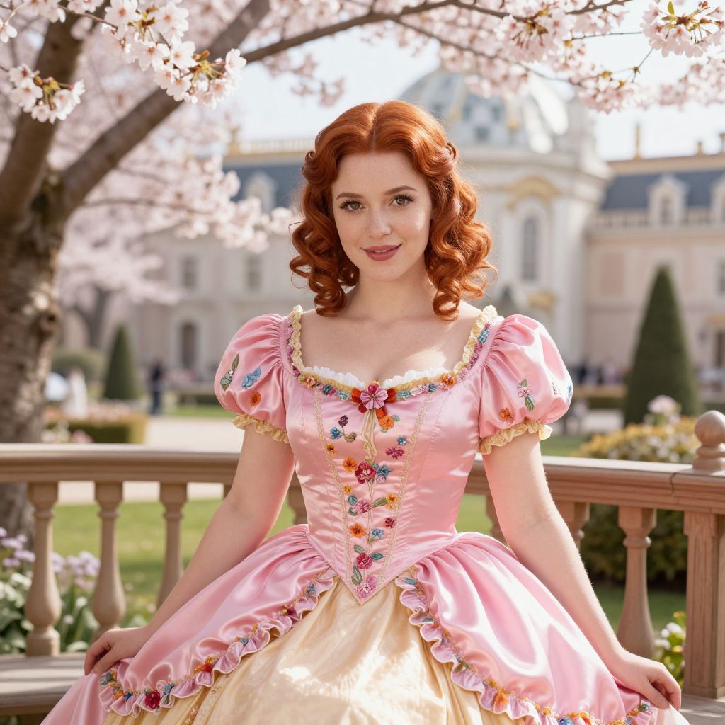 Photograph of a fair-skinned woman with curly red hair, wearing a pink and cream ball gown adorned with colorful floral embroidery. She stands on a wooden balcony, surrounded by blooming cherry blossoms and a blurred, elegant mansion in the background. The sunlight highlights her dress's satin texture and her gentle smile. The image has a slightly enhanced, almost CGI-like quality, with vivid colors and sharp details. The scene is serene and romantic, evoking a fairy-tale atmosphere.