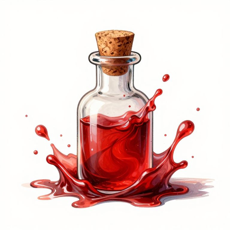 The image is a vibrant, color-drawn portrait of a small vial of red liquid, set against a stark white background. The vial, with its cork stopper, is depicted in a fantasy style reminiscent of Dungeons & Dragons, Wizards of the Coast, and Magic: The Gathering. The liquid inside the vial appears to be swirling, creating a dynamic and somewhat chaotic effect, with splashes and droplets radiating outward in a dramatic fashion. The red liquid contrasts sharply with the white background, making it the focal point of the image. The overall composition is balanced, with the vial centrally positioned, and the splashes extending outward in a symmetrical pattern, creating a sense of movement and energy. The image exudes a sense of magic and mystery, typical of fantasy and gaming art.