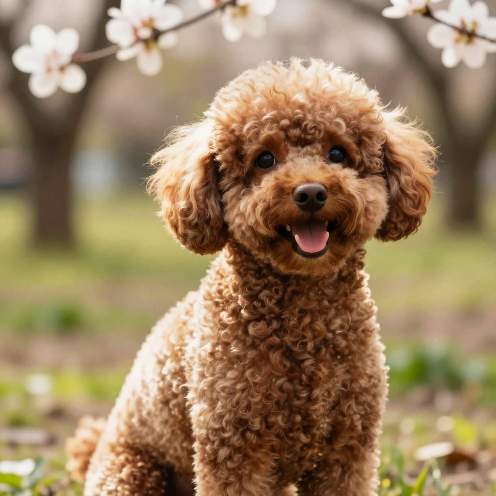 Cute brown poodle sitting in a sunlit park, fluffy curly fur, bright eyes, playful expression, surrounded by blooming flowers, soft focus background