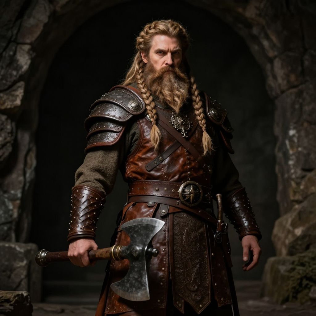 Photograph of a muscular, bearded man with long braided hair, wearing dark leather armor and holding a shield, emerging from a dark, rocky