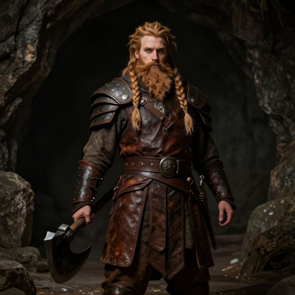 Photograph of a tall, muscular man with a long, thick red beard and braided hair. He wears medieval-style dark brown leather armor with metal shoulder plates and a belt with a circular buckle. He holds a black, round shield in his right hand. The background is a dark, rocky cave with a large, arching entrance. The lighting is dim, highlighting his rugged, determined expression and the texture of his armor. The overall mood is dramatic and heroic.