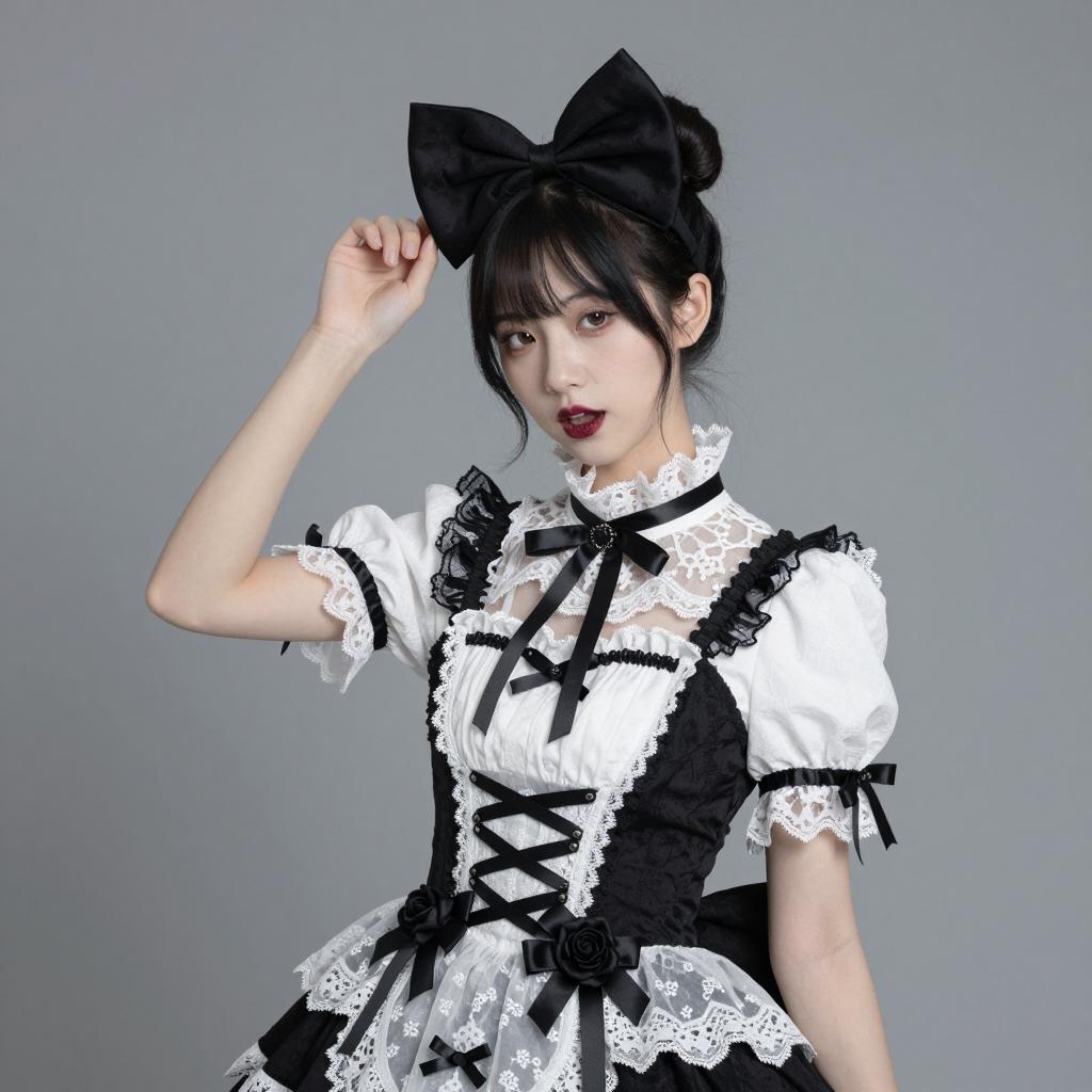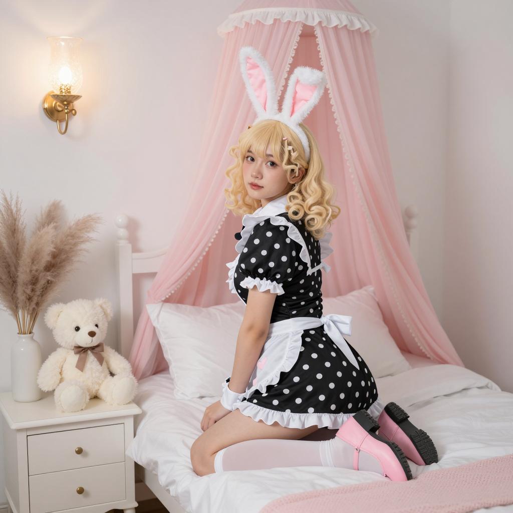 Photograph of a young woman in a black and white polka dot maid outfit with pink accents, white rabbit ears, and curly blonde hair. She stands in a pastel pink and white bedroom, holding a black umbrella. She wears pink platform shoes with black laces and white socks. The bed has a pink satin cover and a white headboard. A vase with white feathers and a small white angel figurine is on the bedside table. She faces slightly to the side with a neutral expression.