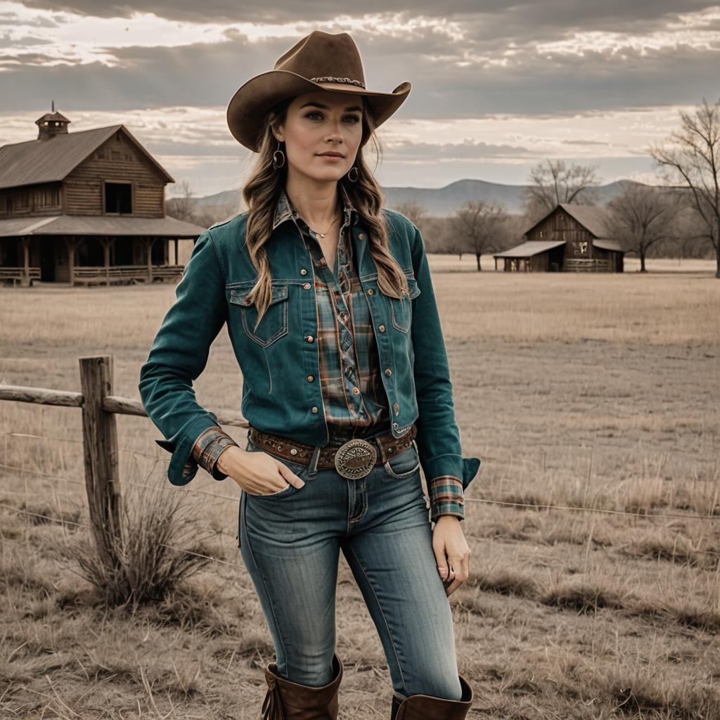 Photo of a Slim woman, Braided, cowgirl outfit ideas, Western style with a Crimson cowboy hat, Suede jacket, Teal plaid shirt, denim skirt, cowboy boots, Out on the ranch, vintage sepia