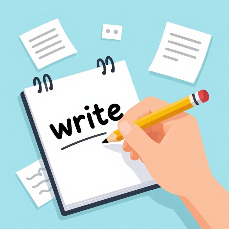 Digital illustration of a hand writing "write" on a notebook with a yellow pencil, surrounded by scattered white paper notes on a light blue background.