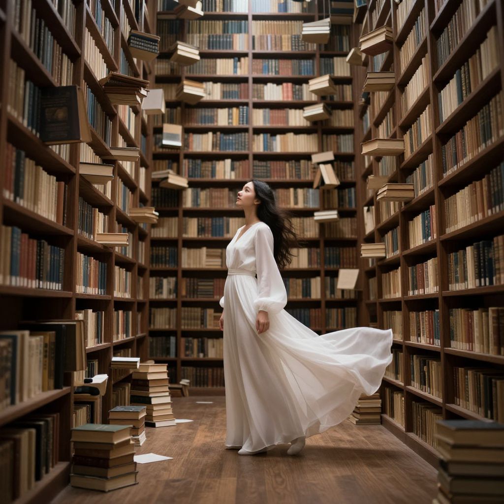 In a timeless library where gravity defies its bounds, a woman in flowing white attire stands amidst cascading books, her presence imbuing the scene with an ethereal, otherworldly grace.