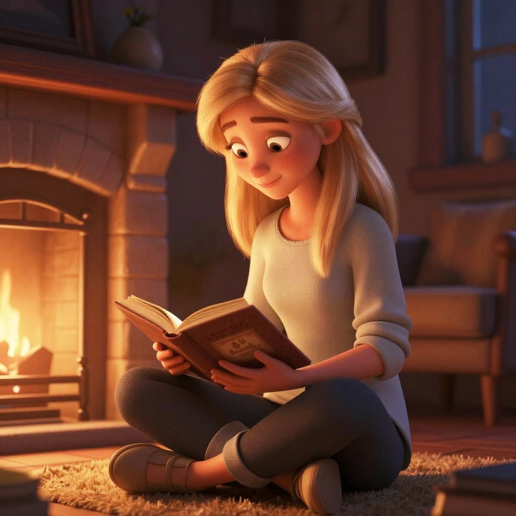 Blonde girl animated sitting by a cozy fireplace reading a book, warm glowing light, soft shadows, detailed indoor setting, charming and heartwarming atmosphere
