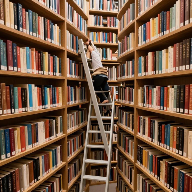 Photograph of a tall, narrow library aisle filled with wooden bookshelves on both sides, packed with books of various colors and sizes. A person, wearing a white shirt and black pants, is standing on a white ladder, reaching up to the top shelf. The ladder is centered in the image, with the person's back facing the camera. The shelves are uniformly arranged, and the books' spines create a colorful, patterned backdrop. The lighting is bright, highlighting the wooden texture of the shelves and the varied book spines. The scene evokes a sense of organized chaos and the pursuit of knowledge.
