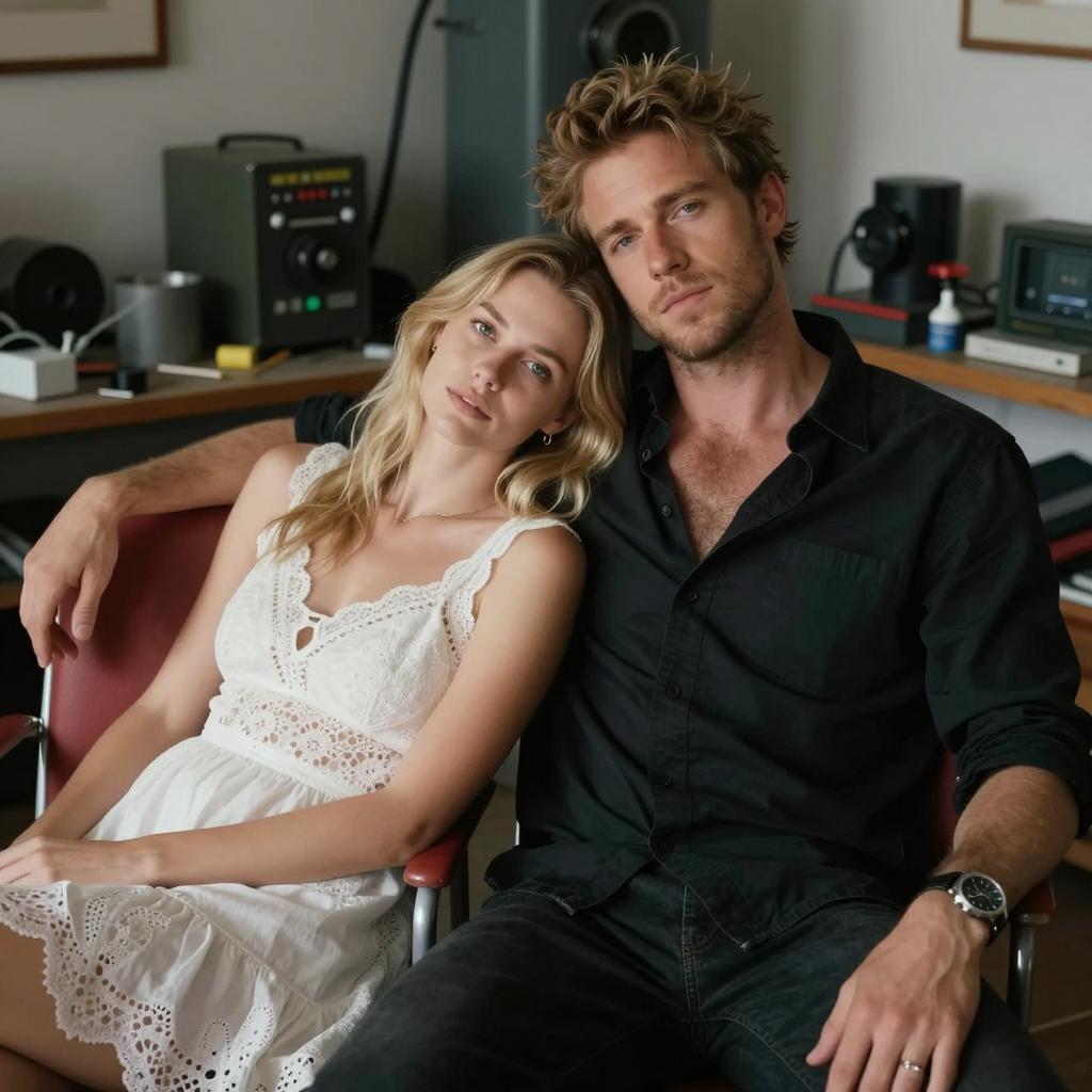 A man and woman in a cluttered room. The man with light brown hair, unbuttoned black shirt, and chest hair leans back in a red chair. The woman with blonde hair, white lace dress, and relaxed expression leans on him. Both have casual, relaxed poses. Background includes various industrial equipment and objects. The man wears a watch on his left wrist. The woman's face is slightly turned toward the camera. Two people.