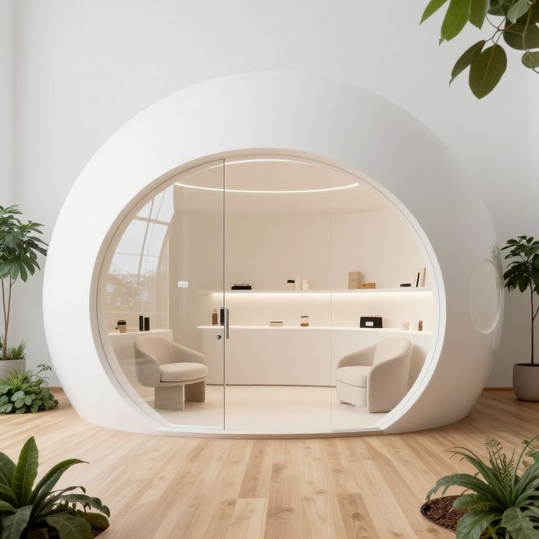 A futuristic, minimalist spherique shop with white walls, ecologic wood floor, and some vegetation, featuring a glass front and two chairs.