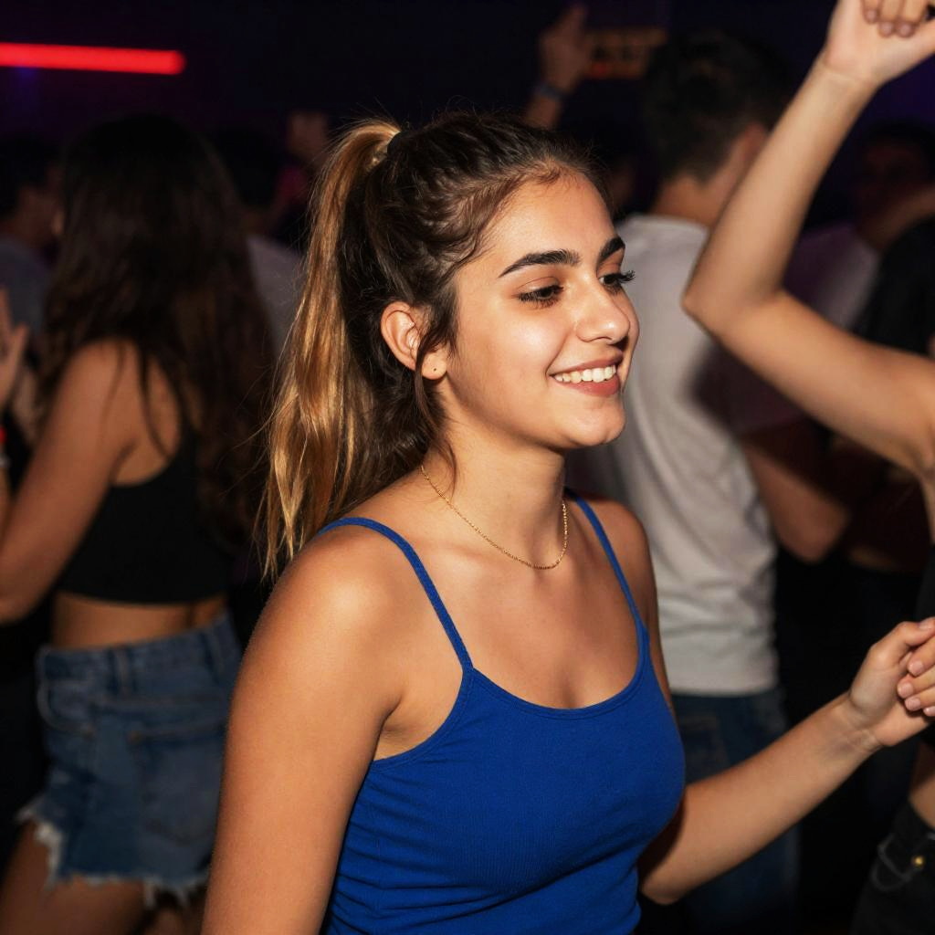 Photograph of a dimly lit nightclub. Three topless women in grass skirts dance in the center, holding colorful accessories. A man in a plaid shirt dances to the left. Background includes a bar with blue lights and people watching. Two large, orange, spherical lanterns hang on the left. The women have various hairstyles and expressions of enjoyment. Several men in the background have neutral or focused expressions.
