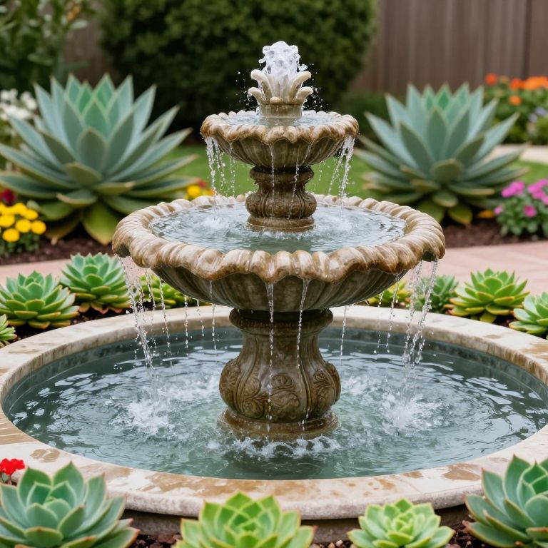 Central stone fountain gracefully cascades water into a shallow basin, surrounded by vibrant green succulents and colorful flowers, creating a serene backyard oasis.