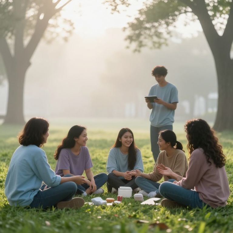 Photograph of five young adults, three women and two men, sitting in a circular arrangement on a grassy park field during sunrise or sunset. They are casually dressed in light-colored, loose-fitting shirts and jeans, with one man standing in the background holding a tablet. The group is engaged in conversation, surrounded by white and red disposable cups. Sunlight filters through large, blurry tree trunks in the background, creating a warm, serene atmosphere. The women have long, dark hair, and the men have short, curly hair.