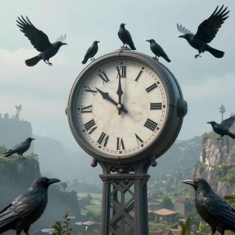 A hauntingly surreal 3D render depicts a towering clock encircled by whispering crows, its hands ticking backwards against a misty valley backdrop, evoking a dreamlike, cyberpunk-inspired atmosphere where time defies its natural flow.