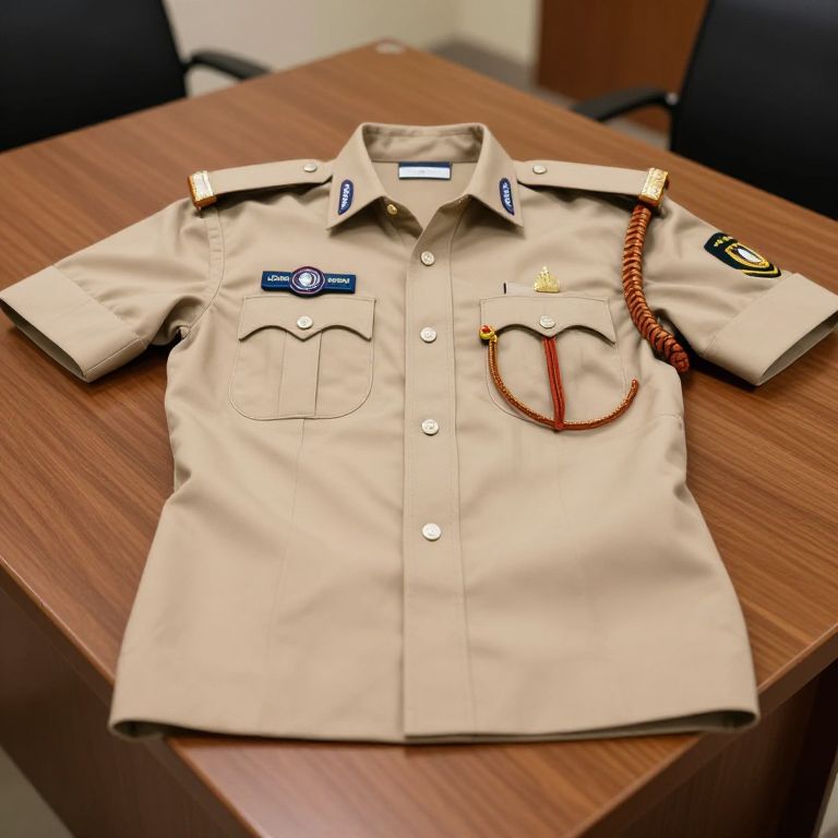 An official Indian police uniform laid out on a wooden table in a police station, clean lines, detailed insignia, emblem on chest, reflective surface, professional setup, studio lighting, realistic material rendering, authentic national detail, Dall-E precision style