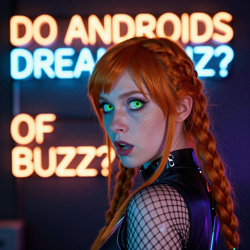 Photograph of a pale-skinned, green-eyed woman with long, braided red hair, wearing a black leather outfit with fishnet sleeves. Her striking green eyes are illuminated by neon lights, and she has a small, silver nose ring. She gazes over her shoulder with a slightly open mouth, adding a sense of intrigue. The background features a neon sign with bright orange and blue letters that read, "DO ANDROIDS DREAM OF ELECTRIC BUZZ?". The lighting and colors create a vibrant, cyberpunk aesthetic.