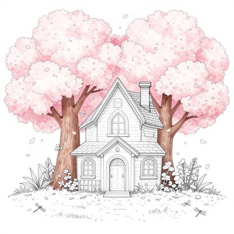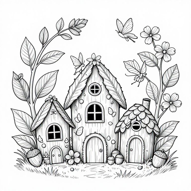 Mystical Experience crisp lines and white background, Coloring book ,fairy houses made of leaves, acorns, and flowers, as well as the fairies themselves.,