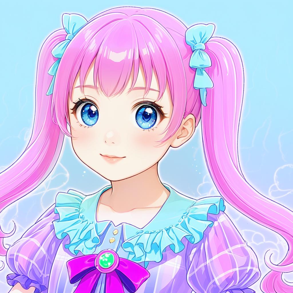 Digital anime-style illustration of a young girl with long pink twin tails tied with blue bows, large expressive blue eyes, and a gentle smile. She wears a pastel purple and blue outfit featuring a ruffled collar and a vibrant magenta bow with a green gem centerpiece. The background is light blue with subtle, soft white effects.