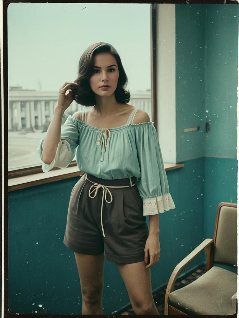 Woman, bohemian chic, white off-the-shoulder blouse with wide, long bell sleeves, gathered elastic neckline, dusty pink high-waisted shorts with tie waist, beige strappy sandals with lace-up detail around the ankle, minimal jewelry, casual indoor retail space background with soft lighting. --sref 1438