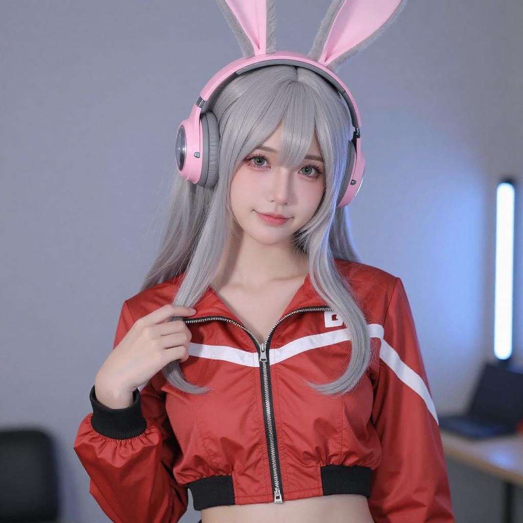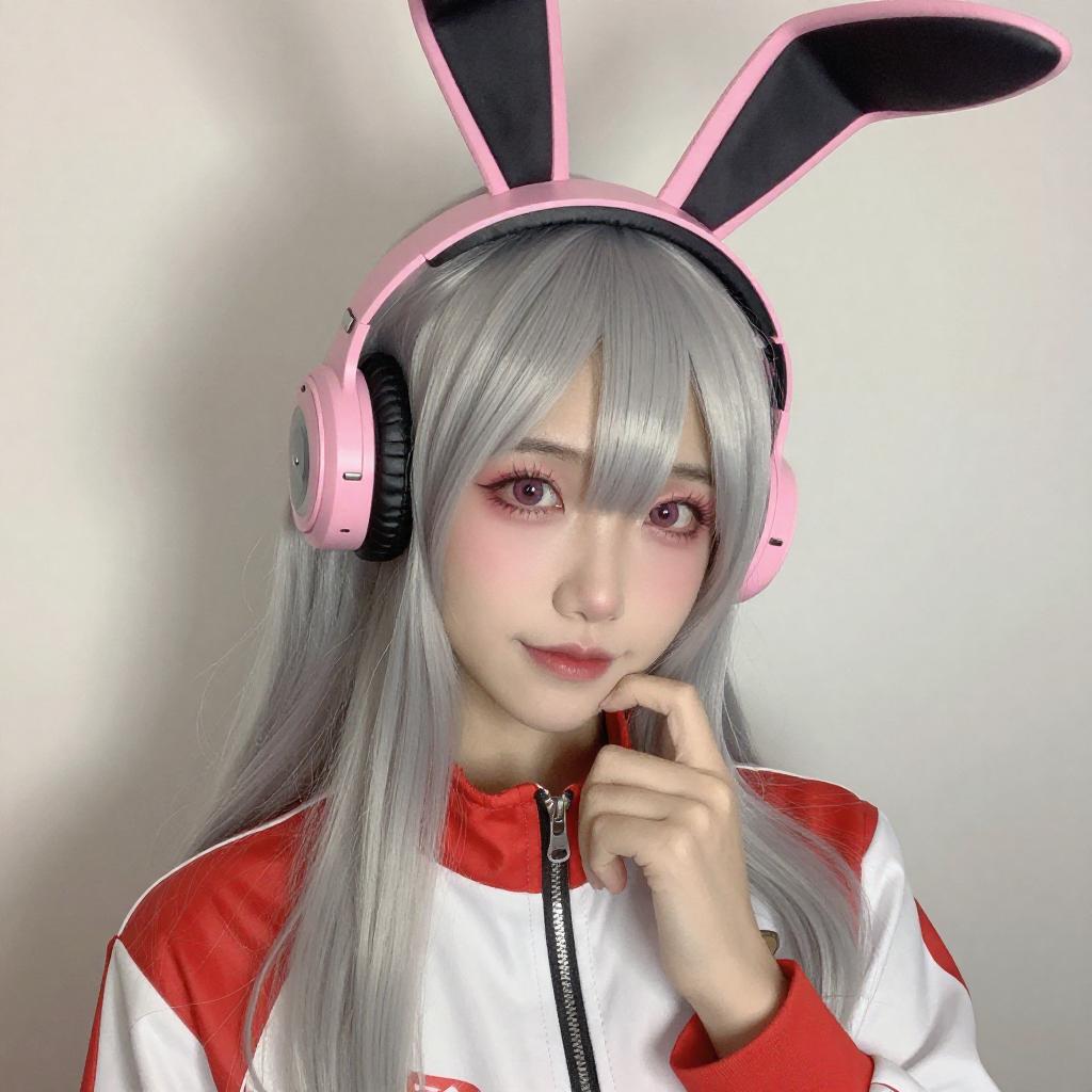 Photograph of a cosplayer with long white hair, wearing a neon pink bunny ear headset, pink and white jacket with black straps, and pink gloves. She rests her cheek on her hand, smiling softly. The background is a gradient of gray to blue.