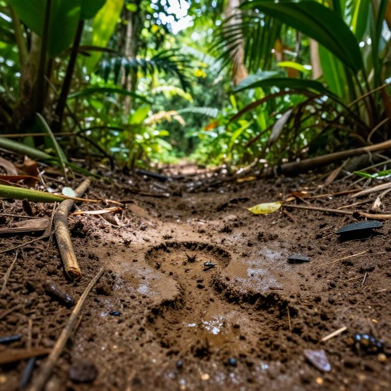 Fussabdruck in mud on jungle floor, surrounded by tropical plants and insects, vibrant greens and earthy browns, dynamic lighting with sun filtering through dense foliage, sense of adventure and exploration, ultra-realistic nature scene capturing moment of passage.