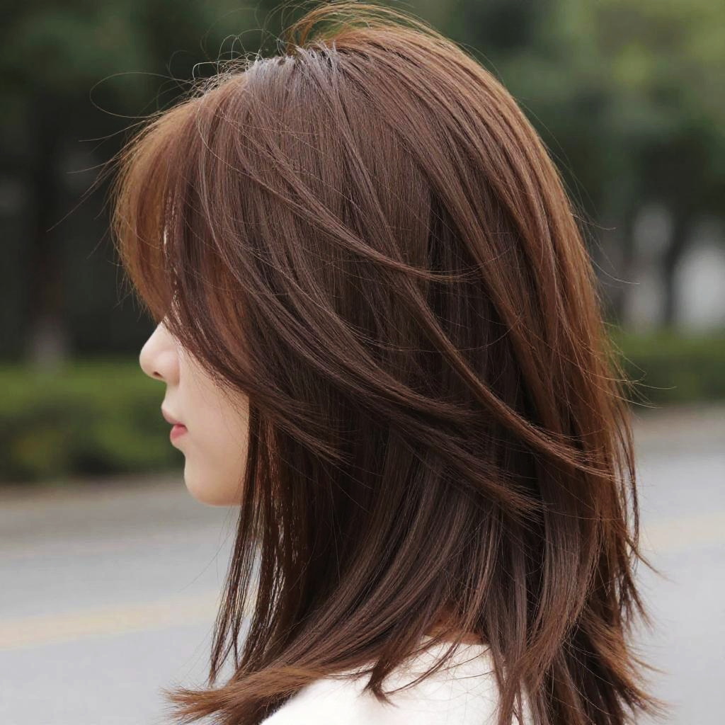 Realistic anime hair styled in intricate layers, rich natural colors with subtle anime flair, hyper-detailed hair strands showing varying thickness and shine, ambient light enhancing volume and depth, character portrait in a serene outdoor setting.