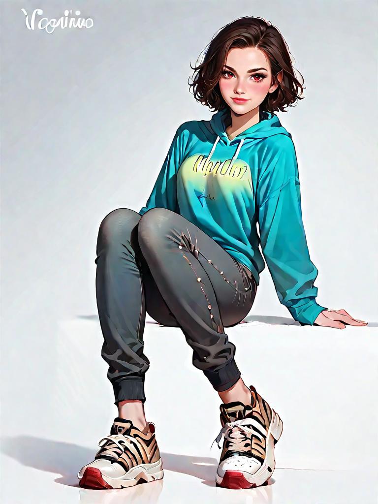 Full body digital illustration of a young woman with short brown hair wearing a turquoise hooded sweatshirt and dark jogger pants with bead details. She is seated against a plain white background, sporting white and beige chunky sneakers. The woman has a realistic face with a slight smile and natural makeup, capturing a casual streetwear look.