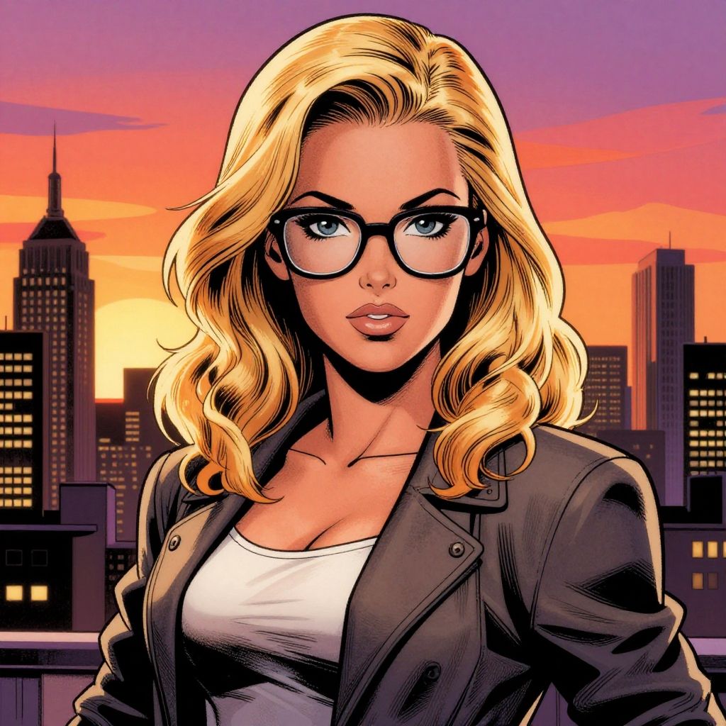 A confident blonde woman with wavy hair and glasses is depicted in a detailed comic book style against a vibrant city skyline at sunset. The illustration highlights her strong features and stylish outfit, blending realism with bold graphic elements.