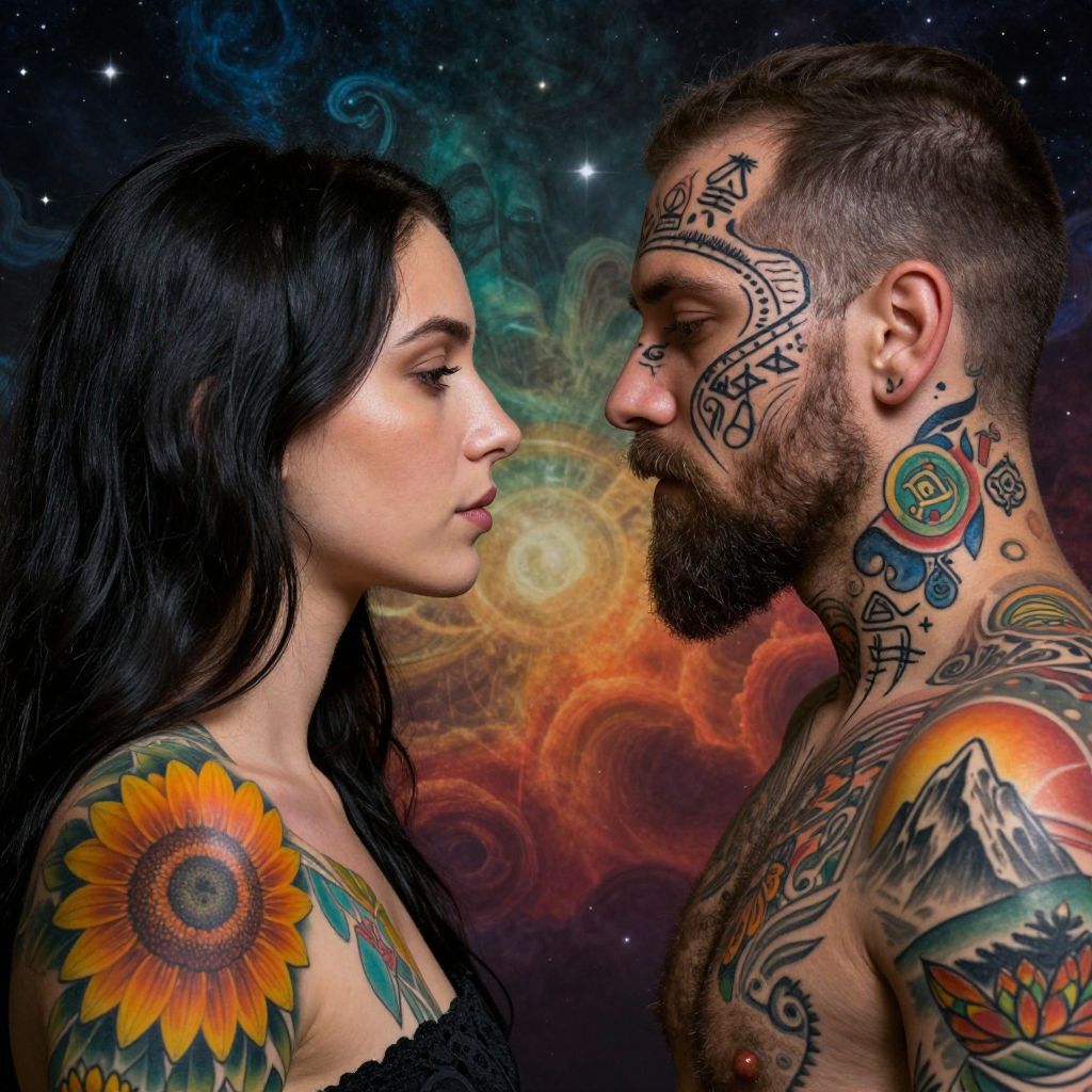 Tattooed couple facing each other, woman with sunflower on shoulder, man with geometric tattoos, cosmic nebula background, photograph.