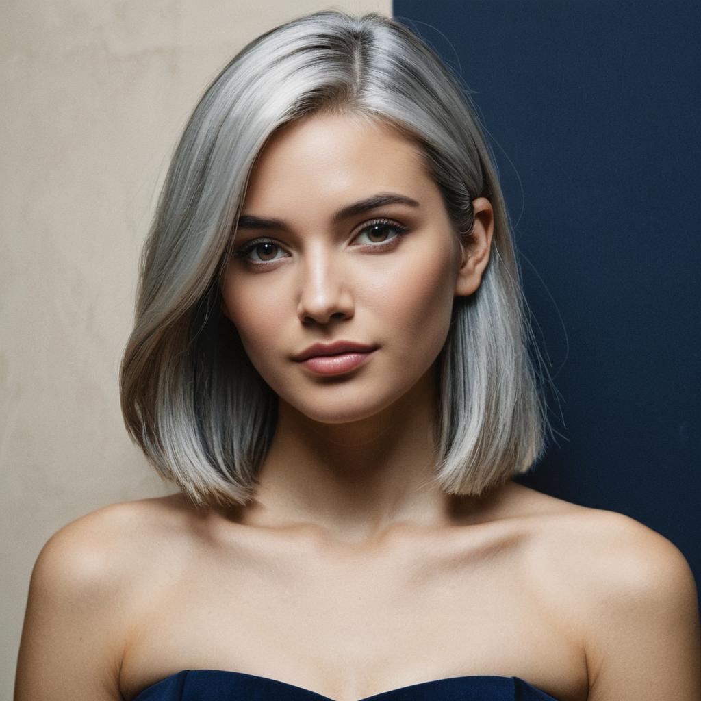 A realistic portrait of a young woman with medium straight silver hair and striking eyes, wearing a strapless navy blue evening dress, cool bluish indoor light accentuating smooth skin texture, warm brown and beige colors, detailed facial features, contemporary art gallery