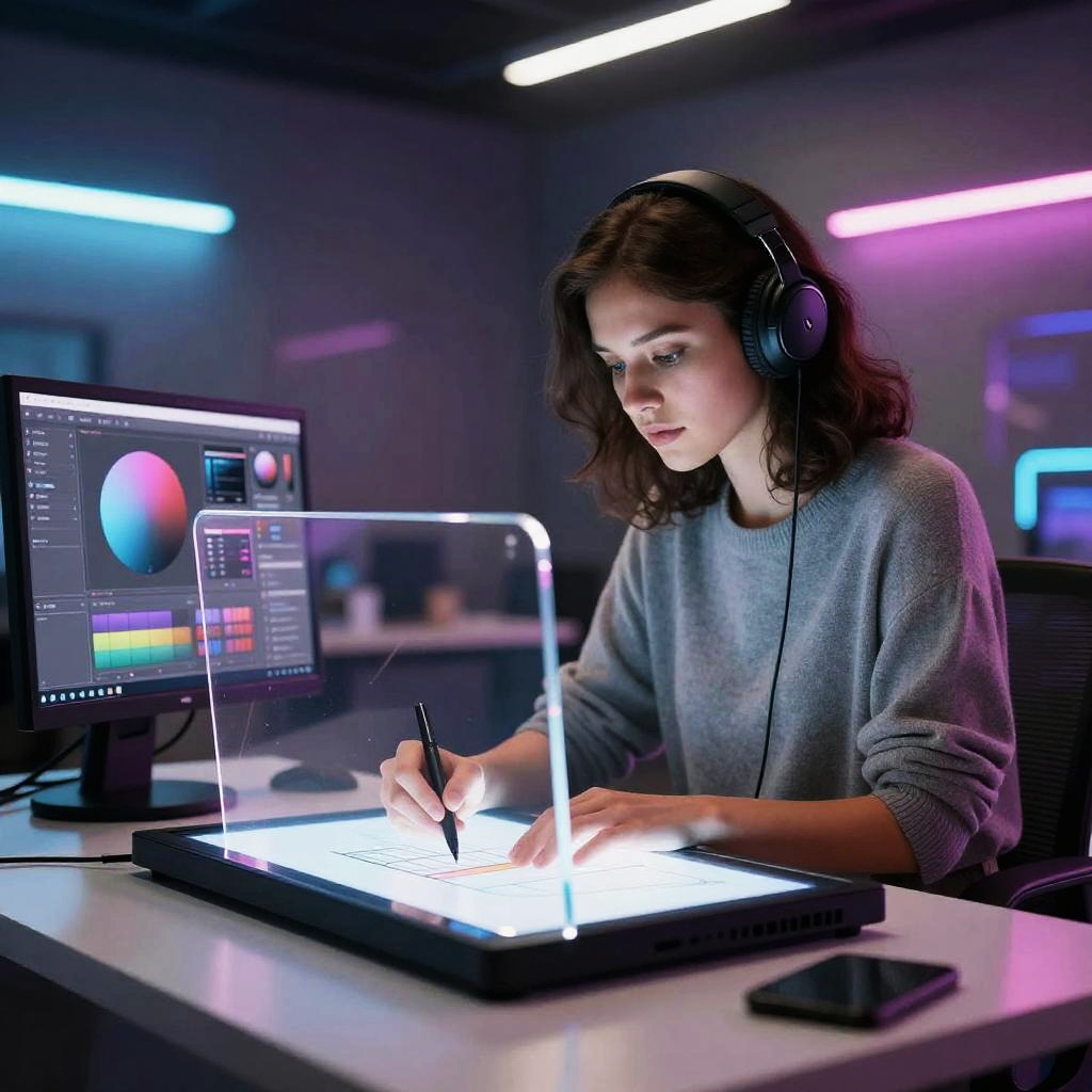 AI redraw image online scene featuring a creative artist using AI-powered software on a transparent touchscreen, ambient neon lights, futuristic studio environment