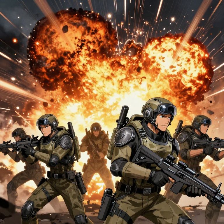 Digital anime-style drawing of four armed soldiers in tactical gear, crouching and aiming at a massive, fiery explosion in the background.