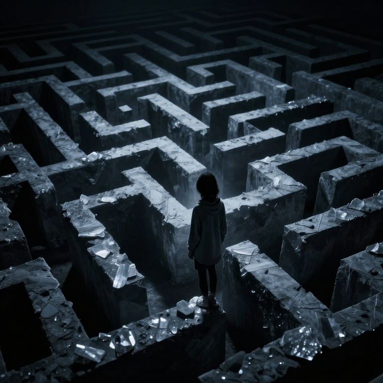An endless maze of crystallized shadows whispers the weight of existential solitude, its jagged edges resonating with the silent echoes of lost wanderers seeking purpose amidst the cold embrace of infinite ambiguity.