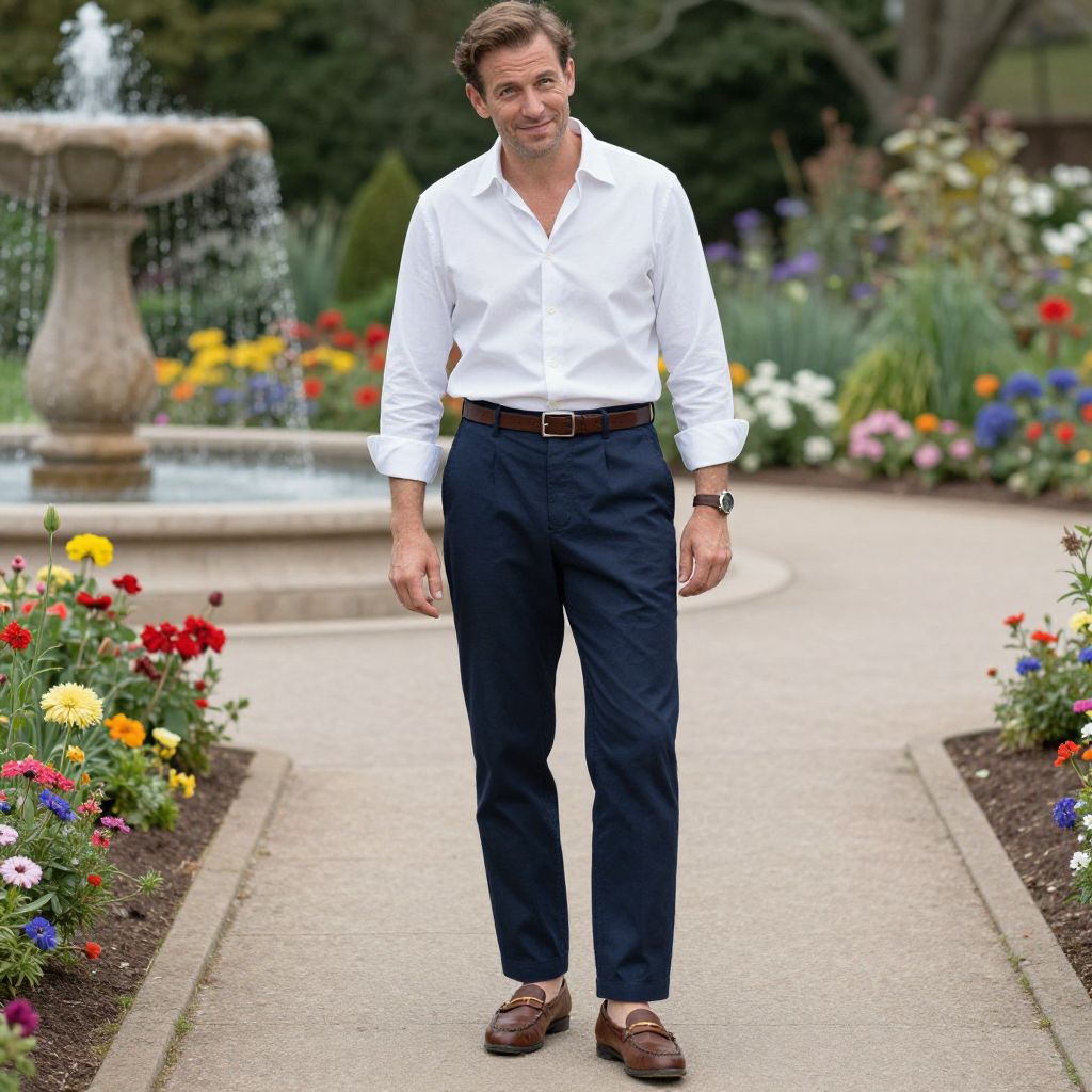 A man, casual chic outfit, navy blue tailored chinos, white cotton button-up shirt, brown leather belt, matching brown leather loafers, outdoor garden with walking paths, vibrant flowers, soothing water fountain, Cibachrome style, relaxed smile, enjoying the moment. Man has masculine face and piercing eyes