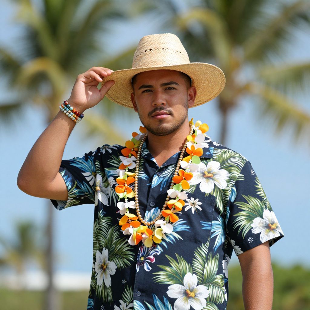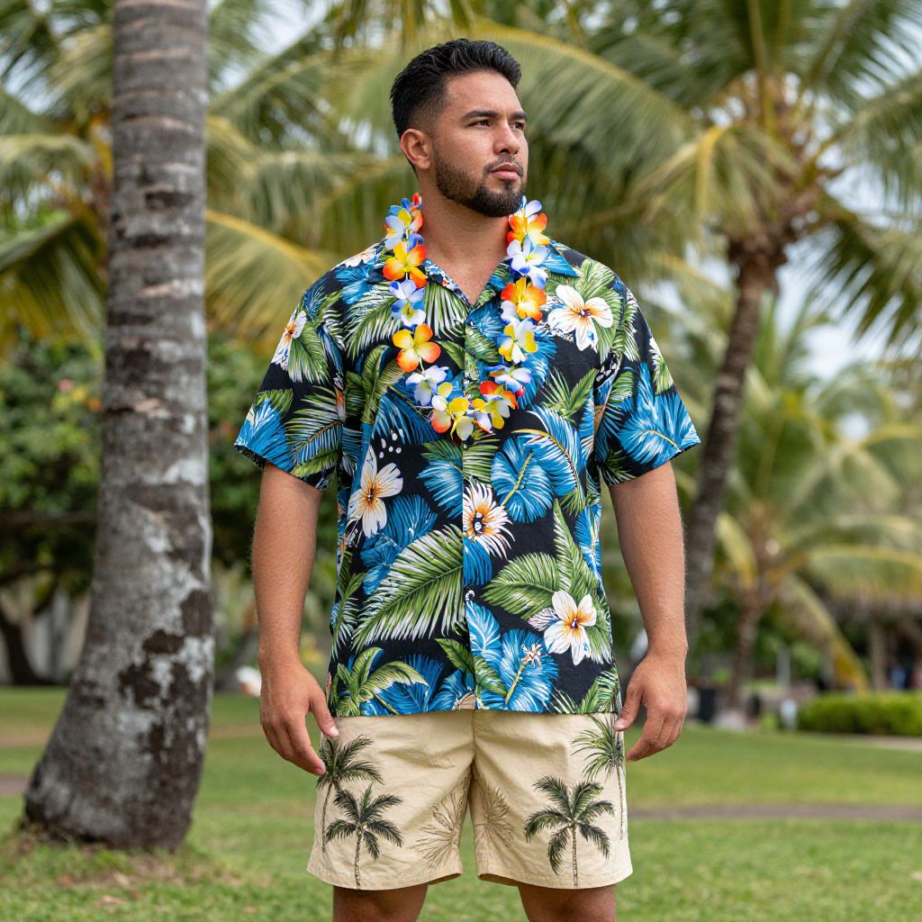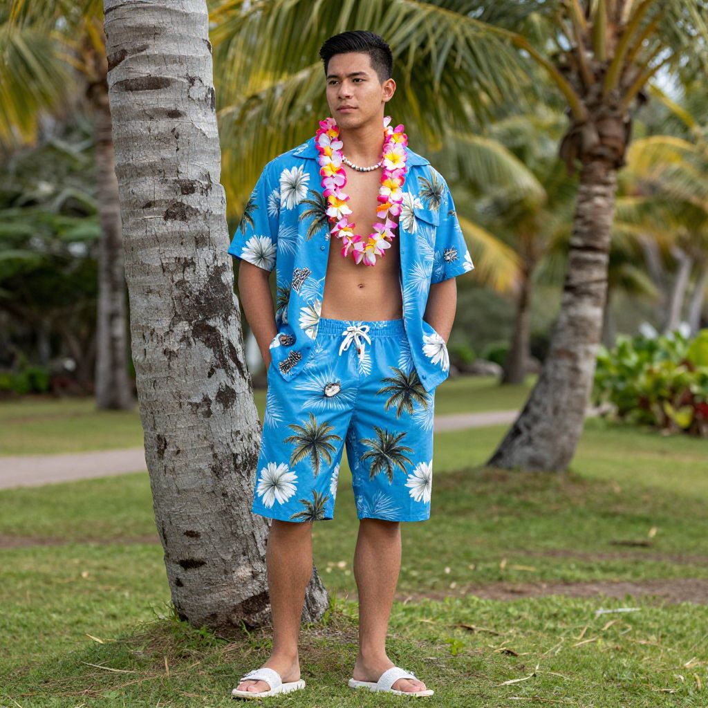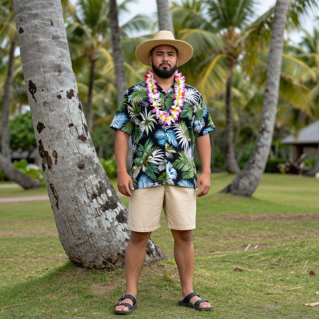 Hawaiian party costume, 1boy, male focus, hawaiian shirt, solo, shirt, tree, open shirt, open clothes, outdoors, sandals, jewelry, palm tree, necklace, full body, navel, old, flower necklace, standing, hands in pockets