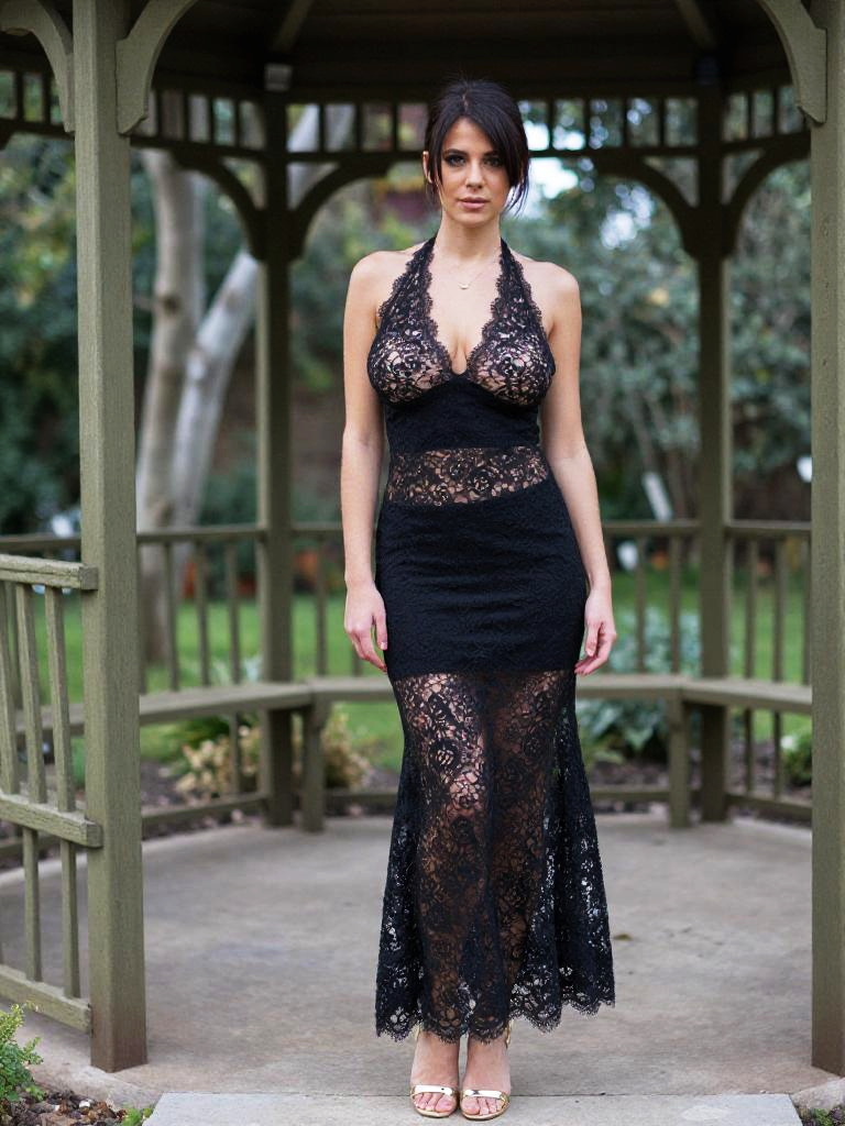 Photograph of a brunette woman with medium skin tone, wearing a black and white patterned wrap with a deep V-neck, turquoise necklace, standing outdoors